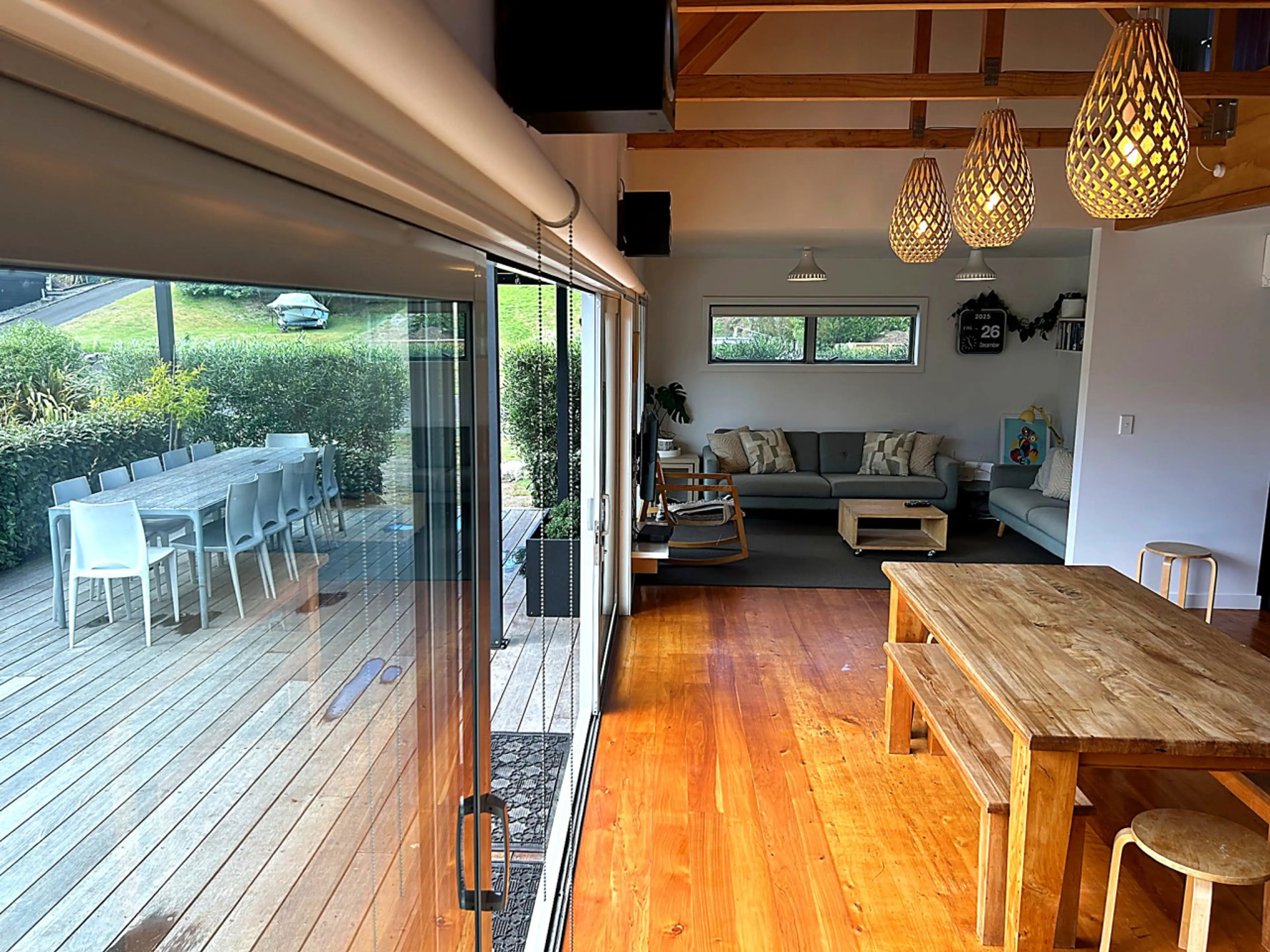 Easy self check in. Kitchen is extremely well equipped for cooking and baking plus air fryer and slow cooker and rice cooker. Great communal areas including outdoor areas which were usable in the bright winter days we were blessed with. Good showers one upstairs bathroom and one downstairs bathroom. Bunk room is downstairs and rest of the bedrooms are upstairs. Light and Bright decor. Great comfy pillows. Many gorgeous wool blankets. We didn’t end up using the wood burner but there was plenty of wood. The house stayed very cosy with just the heat pump run in the morning and later evening. The house is a sun trap in the day.